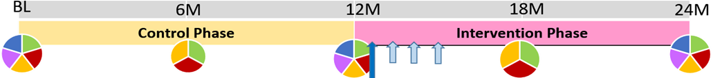 At baseline and every 6-months, we will survey sexual and Menstrual Health Managemengt practices (green), assess VMB (red), and test for BV (orange). We will measure STI (purple) and HIV (blue) at baseline, 12- and 24- months. HSV-2 will be measured at baseline only (not shown in figure). Within 2 weeks of the 12-month visit (blue arrow ), we will conduct menstrual cup training and provide cups to women in groups of 12-15. Telephone survey at 1-, 2-, and 3- months (light blue arrows) will assess menstrual cup use, challenges, and provide trouble shooting. Research staff telephone numbers will be provided should participants require communication between these appointments.
